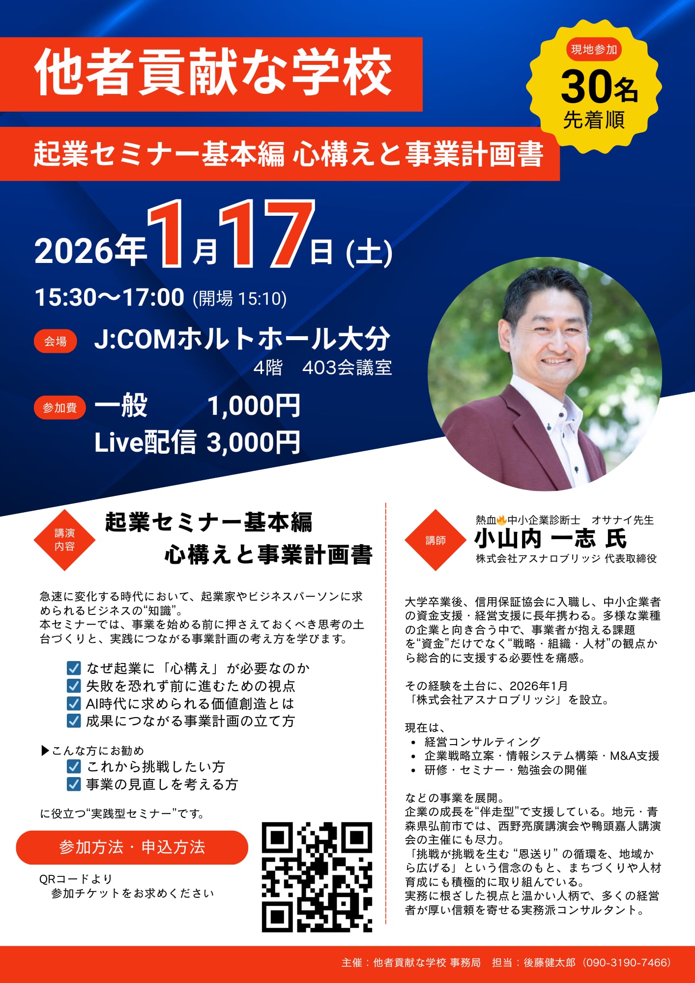 中小企業診断士・小山内一志 氏を講師にお迎えし、起業に必要な考え方と、事業計画書の基本を学ぶセミナーです。